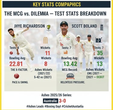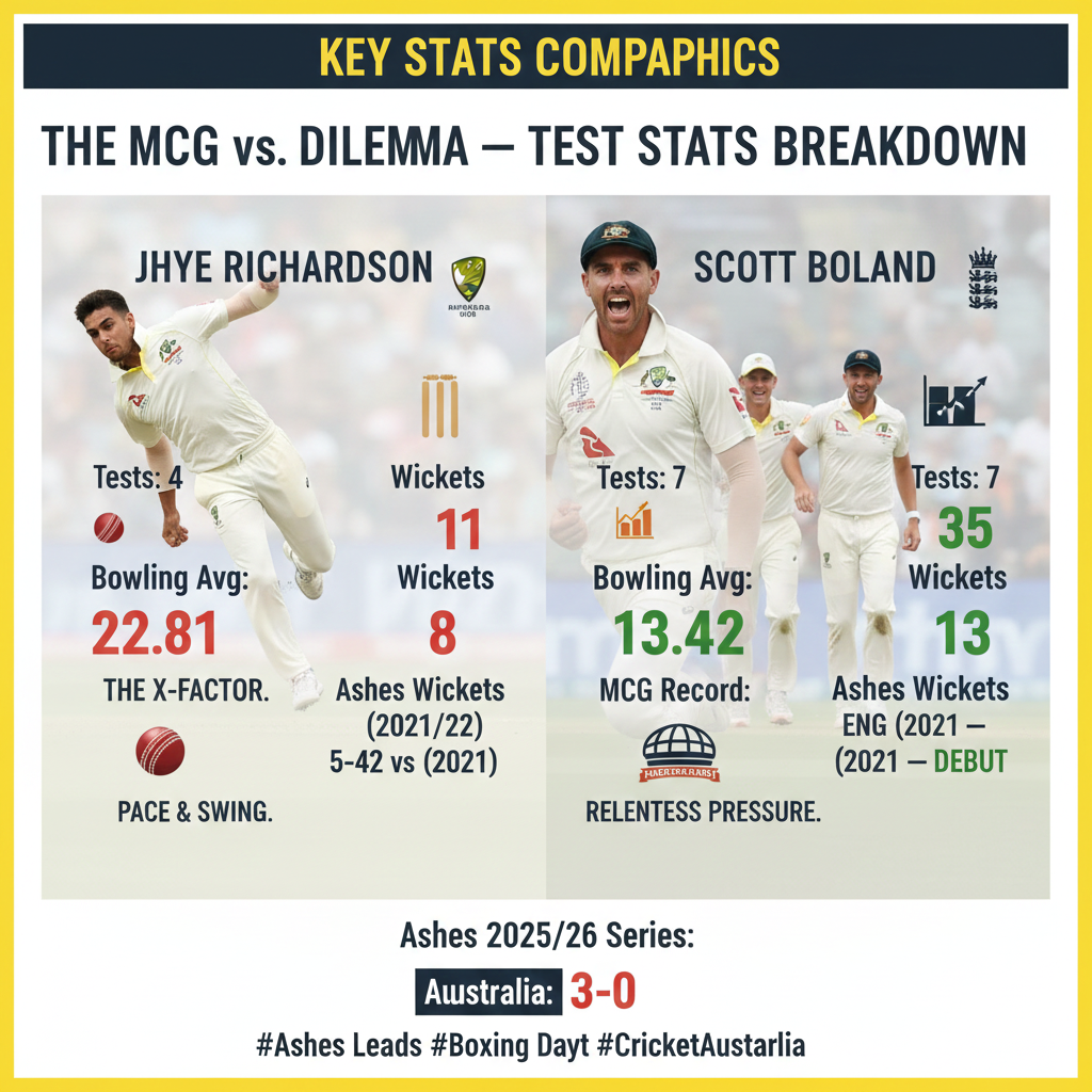 Watch Out For: The Boland Factor While Richardson is the headline, Scott Boland remains the MCG's king. Every time he runs in from the Great Southern Stand end, the "Build-a-Boland" chants remind us why he is the heart of this Australian attack. If Richardson provides the fire, Boland provides the relentless pressure that has kept England "caged" all series.